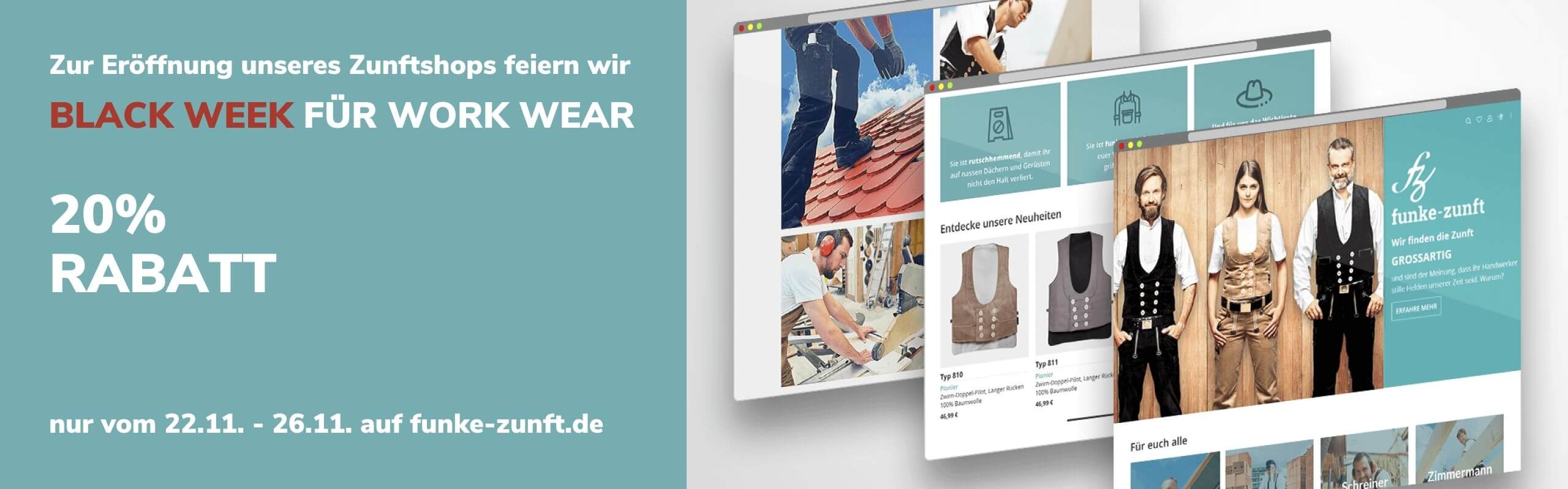 Die Schnäppchenjagd ist bei uns ganz einfach: Besuchen Sie uns während der Black Week für Work Wear auf funke-zunft.de. Registrieren Sie sich während des Aktionszeitraumes, stöbern Sie in unserem Sortiment, suchen Sie sich ihre Lieblingsstücke aus und sparen Sie mit Rabatten von bis zu 20%.